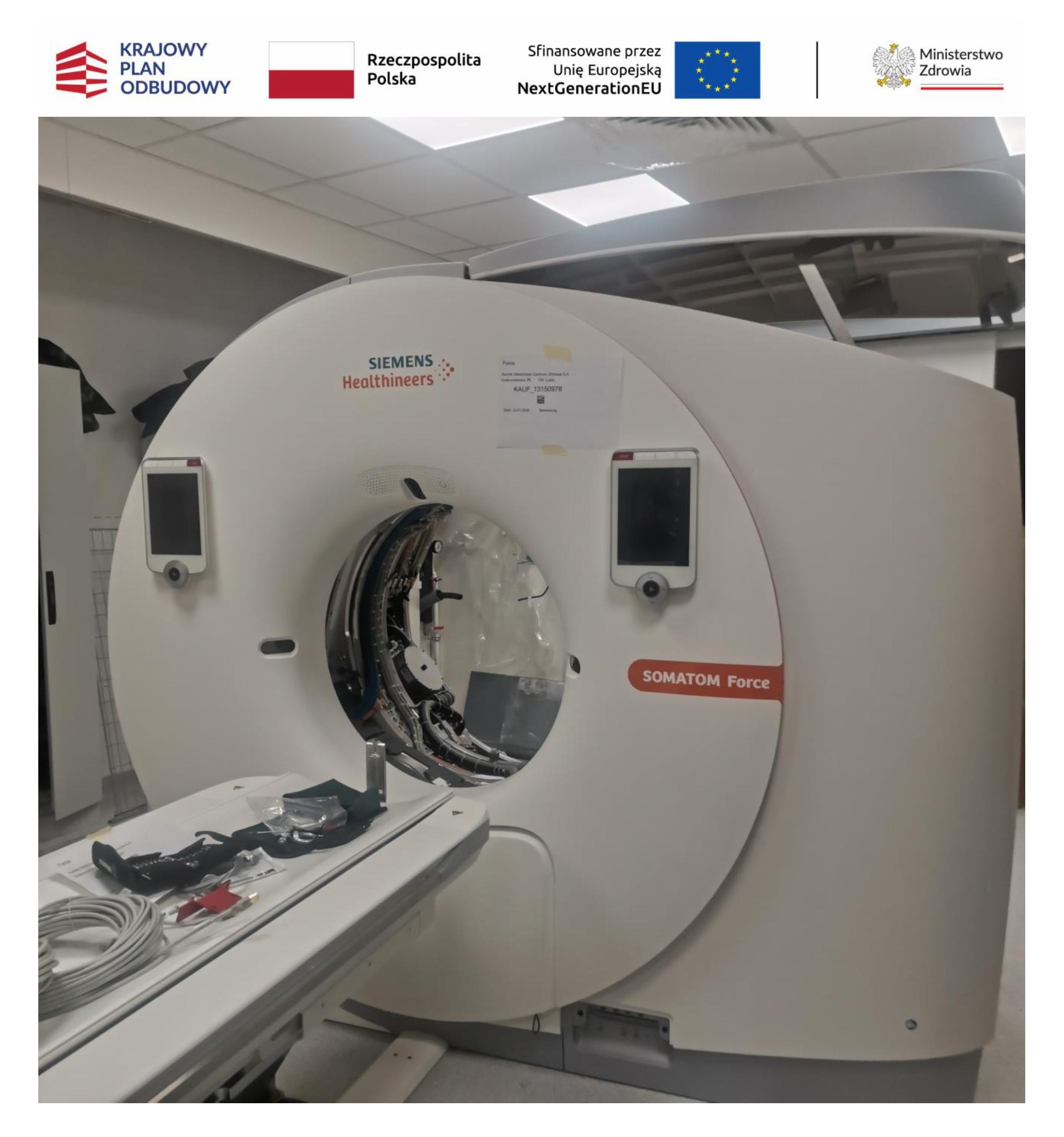 W ramach realizowanego projektu pn. „Poprawa jakości, dostępności oraz efektywności diagnostyki i leczenia kardiologicznego w „MIEDZIOWYM CENTRUM ZDROWIA” S.A.” dofinansowanego ze środków Krajowego Planu Odbudowy (KPO) w dniu 14.02.2026 r. dostarczony został nowoczesny Tomograf Komputerowy.