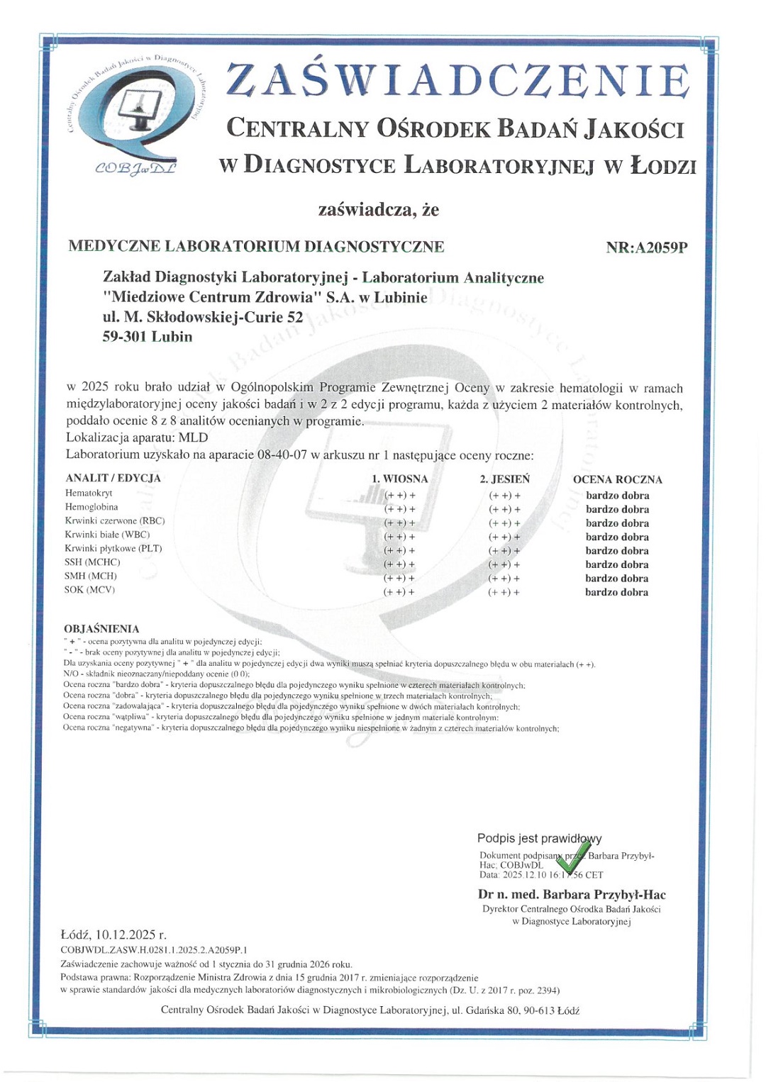 Zakład Diagnostyki Laboratoryjnej "MCZ" S.A. w Lubinie, posiada dwa cytometry przepływowe do oznaczeń morfologii krwi: SYSMEX XN 1000- 5 diff oraz SYSMEX XN 1000 - 5 diff z możliwością oznaczania retikulocytów i płytek krwi metodą optyczną