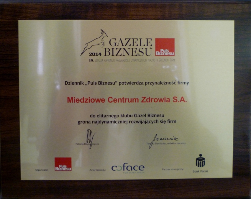 "Miedziowe Centrum Zdrowia" S.A. w Lubinie po raz piąty zostało uhonorowane tytułem Gazeli Biznesu, utrwalając tym samym swoją pozycję w elitarnym klubie najdynamiczniej rozwijających się małych i średnich firm. W 2014r. odbyła się 15 edycja rankingu, organizatorem którego jest dziennik "Puls Biznesu".