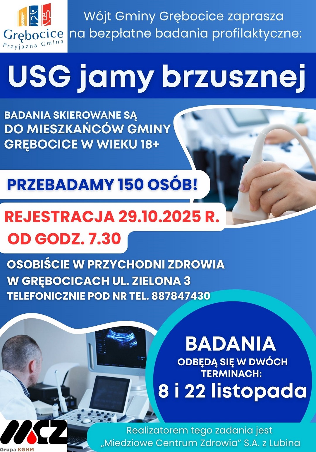 "MIEDZIOWE CENTRUM ZDROWIA" S.A. realizuje, na rzecz pełnoletnich mieszkańców Gminy Grębocice, Program Polityki Zdrowotnej – „Badanie USG jamy brzusznej dla mieszkańców Gminy Grębocice”. Program realizowany jest w placówce zdrowotnej na terenie Gminy Grębocice – Przychodnia Lekarska „MCZ” S.A. przy ul. Zielonej 3A w Grębocicach.