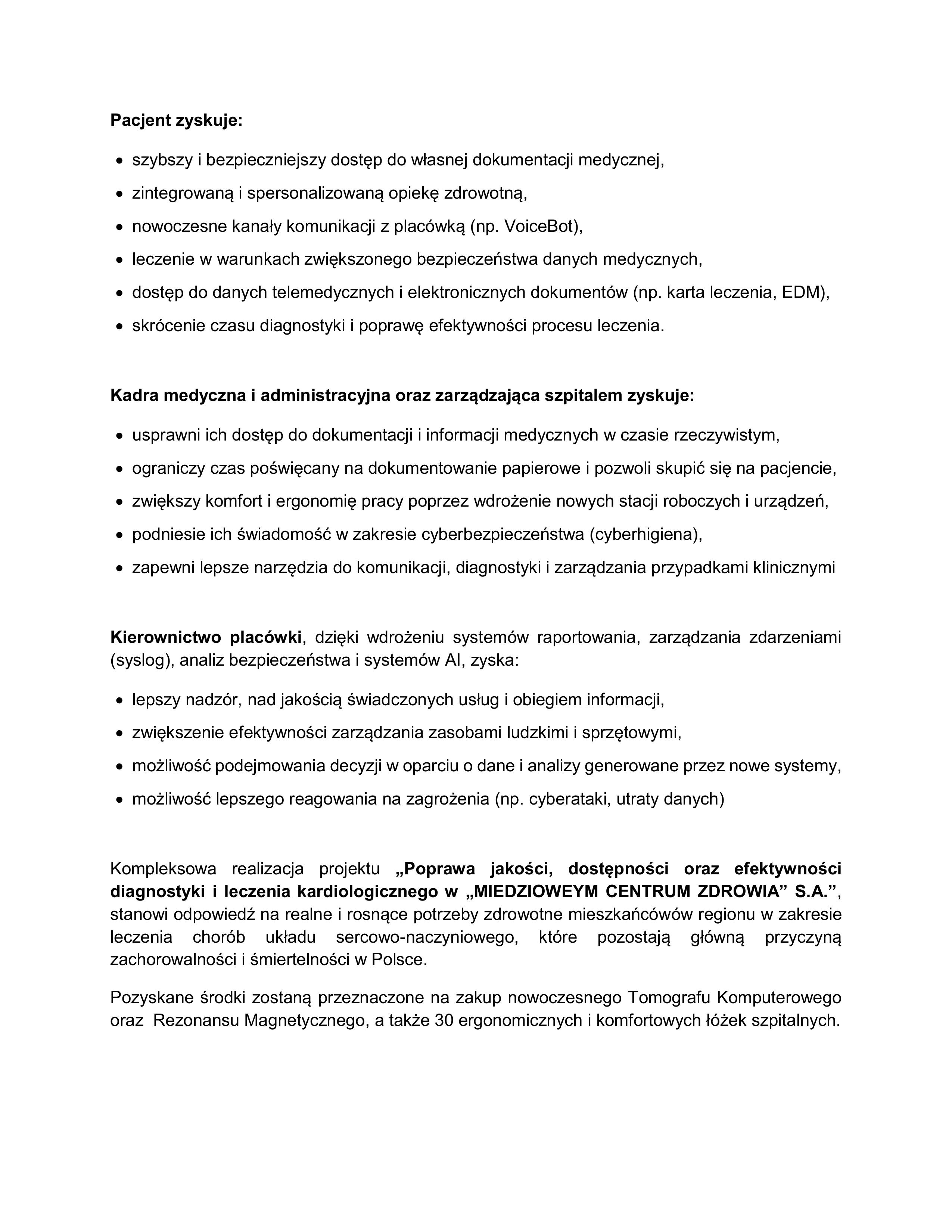 Dzięki realizacji projektu pn. „Przyspieszenie procesów transformacji cyfrowej w „MIEDZIOWYM CENTRUM ZDROWIA" S. A. poprzez dalszy rozwój usług cyfrowych”, „MCZ" S.A. stanie się nowoczesną, cyfrową jednostką medyczną, gotową na wyzwania przyszłości w obszarze e-zdrowia, spełniając najwyższe standardy technologiczne i bezpieczeństwa. Realizacja ww. projektu to korzyści zarówno dla pacjenta jak i kadry medycznej, administracyjnej oraz zarządzającej Szpitalem.