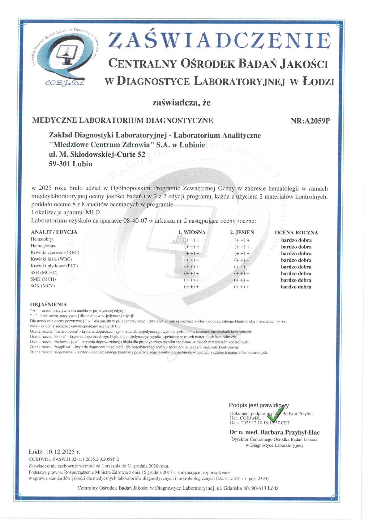Zakład Diagnostyki Laboratoryjnej "MCZ" S.A. w Lubinie, posiada dwa cytometry przepływowe do oznaczeń morfologii krwi: SYSMEX XN 1000- 5 diff oraz SYSMEX XN 1000 - 5 diff z możliwością oznaczania retikulocytów i płytek krwi metodą optyczną